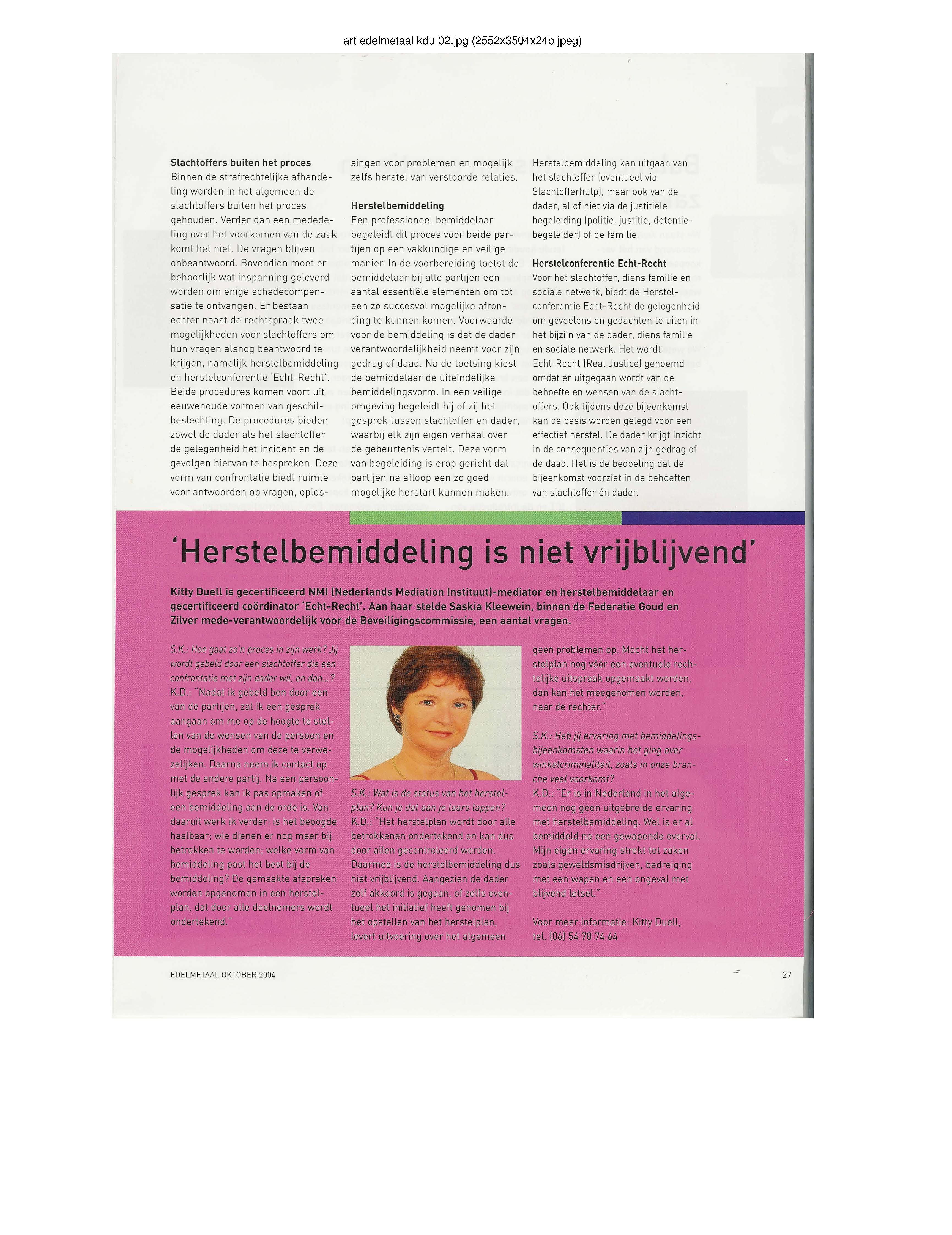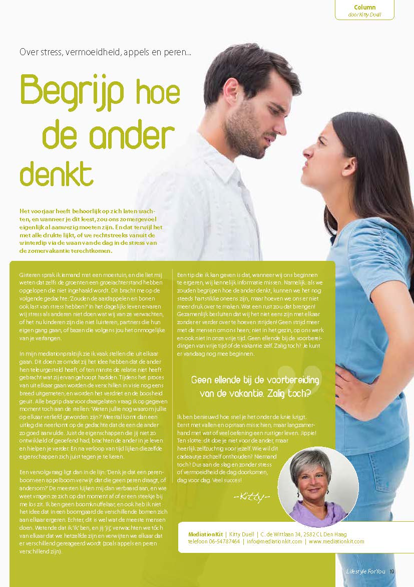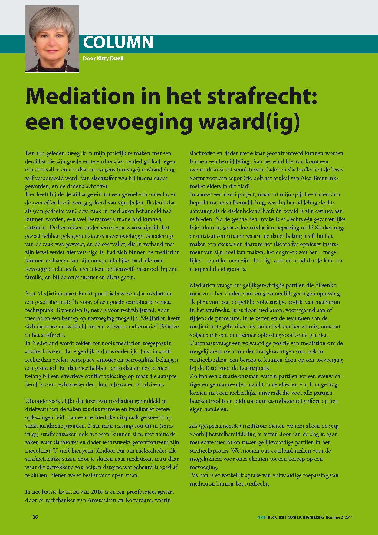 Kitty Duell zet sinds 1999 haar ervaring en kennis in om mensen en bedrijven in een conflictsituatie te begeleiden naar een voor alle partijen werkbare oplossing. Kitty is veelvuldig gecertificeerd als mediator, trainer en coach. Zij doet mediations en geeft trainingen en presentaties in binnen- en buitenland. Ook voor online mediation ben je welkom bij MediationKit. Bel meteen vrijblijvend voor informatie: 06 54 787 464.